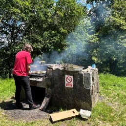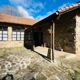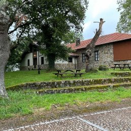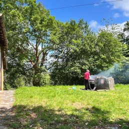Volvemos sobre nuestros pasos hacia la entrada principal del aterpetxe —sureste—; subimos por las escaleras, o la rampa, hacia el porche. Vemos a la derecha unas toscas mesas de madera de merendero, bajo las poderosas ramas de los robles, una fuente de agua fresca —elixir para los ciclistas— y dos barbacoas instaladas sobre un único murete de piedra. Nos hallamos ahora ante la entrada principal de la casa. Nos recibe un porche de madera y teja, adornado con plantas y flores; un llamador de bronce en la puerta nos transporta al pasado. Y volvemos a entrar. Un buen desayuno y…