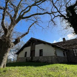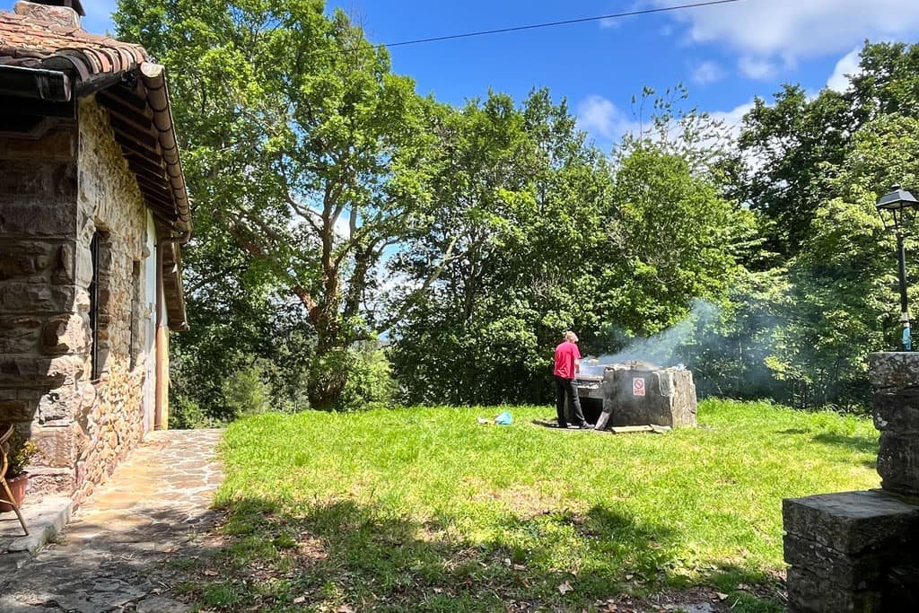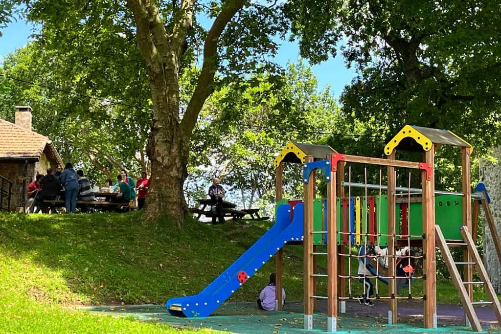 ¿Qué os parece si salimos a dar un paseo a pie y respirar aire puro? Al asomarnos por la puerta del lado norte de la casa, aparece ante nuestros ojos una pradera de hierba, la presencia mágica de un robledal centenario y un pequeño jardín; si giramos a la izquierda —noroeste—, veremos una caseta de madera de aseos públicos, y una pista —probaleku— de deportes tradicionales vascos cubierta de musgo —sólo activa en junio con motivo de las fiestas de San Juan, en Errigoiti, el pueblo más cercano—, y si seguimos rodeando la edificación hacia el sur, dejando a la izquierda el txoko —sociedad gastronómica de Metxika­, anexa a la casa—, llegaremos a un miniparque de juegos, con pasadizos, tobogán y una hamaca-columpio circular que hace las delicias de niños y mayores