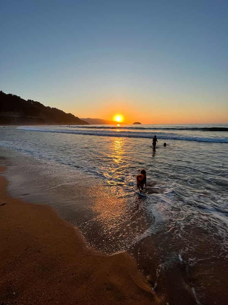 Si esta excursión nos ha sabido a poco, podemos descender, dentro de este biotopo —ya rumbo oeste—, hasta la playa turística y arenosa de Bakio, llena de vida, de gente tomando el sol, bañándose o practicando surf y otros deportes acuáticos. Al atardecer, miramos al cielo —lienzo pintado de conmovedores colores—, regresamos a Forua, y de ahí a casa.