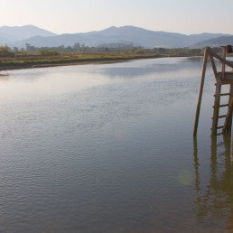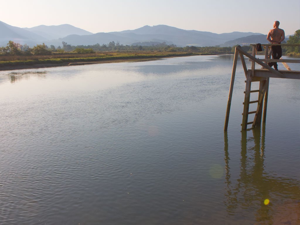 La casa está situada en un cruce de caminos, desde donde podemos decidir si ir a las playas o a los puertos, al monte, a la civilización o al bosque. Cada quien elige el cuento de hadas o la aventura que le apetezca vivir. ¿Vamos a ver el mar? Entonces, lo más cómodo es subirnos al coche —o a la motocicleta o bicicleta, o caminando, los más intrépidos—, e ir hacia el norte. Pasando por el barrio residencial de Metxika, tomamos una carretera local flanqueada por prados con vacas, ovejas y yeguas pastando, y más adelante, adentrándonos en bosques de pinos y eucaliptos de gran altura, llegamos a una carretera convencional de dos carriles que nos lleva hasta Forua. Aquí es mejor aparcar; subirnos al tren en dirección Bermeo y mirar por las ventanillas de la derecha la maravillosa marisma…