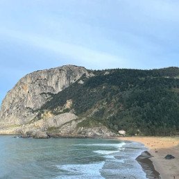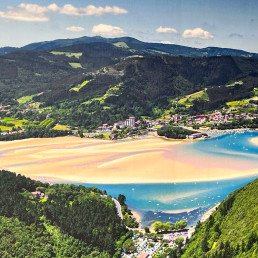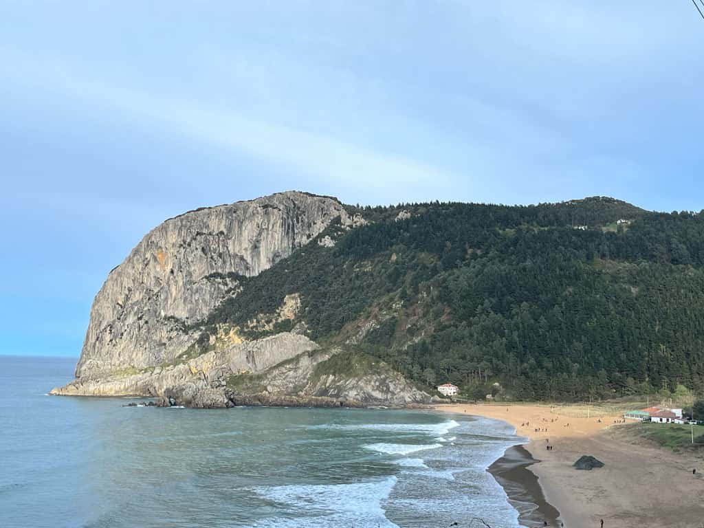 La siguiente es Laida, playa cambiante de dunas, desde donde es posible cruzar al otro lado de la ría, caminando sobre la arena, cuando la marea está baja, y admirar a gente joven practicando deportes acuáticos espectaculares: kite surf, paddle surf, piragüismo, vuelo de cometas… Subiendo por la carretera costera, embebidos por la hermosura del mar y después de unas cuantas curvas, descendemos hasta la playa más popular y mejor catalogada de Bizkaia: